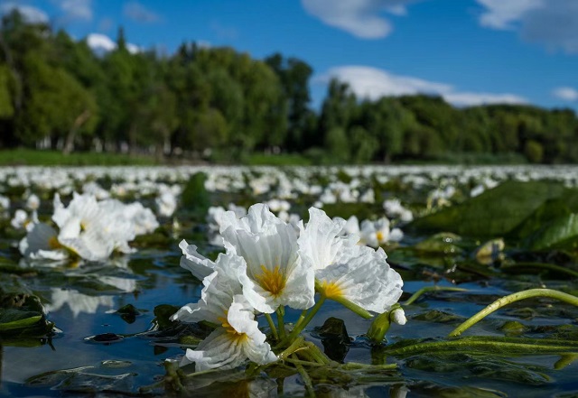 在云南大理洱海,海菜花正連片綻放,微風(fēng)搖蕩,薄薄的白色花瓣如同水晶般晶瑩剔透,與鵝黃的花蕊一同一顫一顫兒地搖曳起來,遠遠望去,似雪非雪卻勝雪。