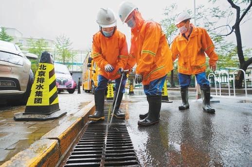 昨天9時許,在朝陽區管莊路上的一處排水口旁,兩名北京排水集團的防汛人員先用錐桶做好警戒防護,接著用鉤子鉤起雨水箅子,加速排水。在朝陽區金泰橋下凹橋區,北京排水集團壩河流域分公司的工作人員早六時就到達現場進行值守。“這個點位地勢較低,短時雨量大的情況下容易造成積水,為避免影響交通,我們提前做好了準備。”現場一位工作人員說。
