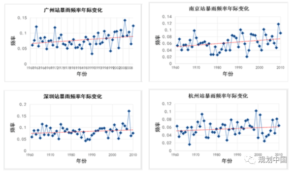 分析全國主要城市60年來的氣象數(shù)據(jù)發(fā)現(xiàn),隨著溫度升高,短歷時強降雨天氣增加,大多數(shù)城市暴雨都更多了,這是一個趨勢,增加了城市洪澇災(zāi)害的風險。
