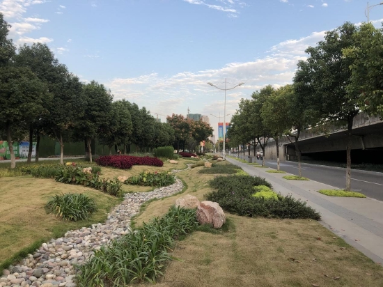 城市道路兩側(cè)的綠地也是改造的重點區(qū)域之一。在德陽市青衣江路,除了新增設(shè)的雨水花園外,道路兩側(cè)的綠地都比過去變“矮”了一些。