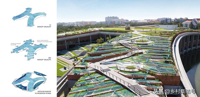 當(dāng)雨水擊中屋頂時,首先農(nóng)作物的種植加強了土壤的肥沃度,減少了雨水期間的水土流失,并有效防止污染徑流和空氣中的毒素從排水系統(tǒng)和自然水體中進(jìn)入。多余的雨水會沿著斜坡蜿蜒而下,下一層梯田就會收集上一層的徑流,所到之處會形成獨特的小分水嶺群,幫助吸收、過濾和凈化雨水。