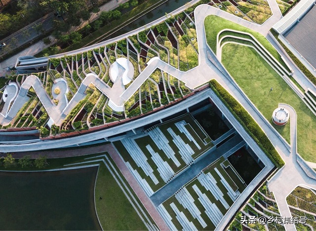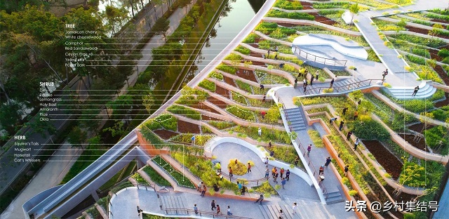 在景觀設(shè)計中,設(shè)計師試圖讓垂直建筑與食物來源產(chǎn)生重合,于是在受到了東南亞山區(qū)的傳統(tǒng)農(nóng)業(yè)實踐的獨創(chuàng)性啟發(fā)后,農(nóng)場采用了傳統(tǒng)水稻梯田的形式,結(jié)構(gòu)采用古老的夯土技術(shù)建造,并將其土方工程與現(xiàn)代綠色屋頂技術(shù)相結(jié)合,實現(xiàn)了現(xiàn)代景觀與傳統(tǒng)農(nóng)業(yè)的創(chuàng)意發(fā)展。相比傳統(tǒng)的混凝土屋頂,經(jīng)過層疊設(shè)計的梯田屋頂更能有效減緩多達(dá)20倍的雨水徑流。