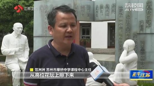 蘇州市草橋中學課程中心主任范洲洲:“通過雨水管道從高位花壇上排下來,一部分排到地下的管網,還有一部分留在了罐子里,作為植物的灌溉需求?!?br />