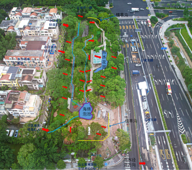 為解決以上問(wèn)題,本項(xiàng)目因地制宜設(shè)置植草溝、透水鋪裝、旱溪、蓄水池等海綿設(shè)施,起到源頭減排、過(guò)程控制、末端治理回用效果,并充分發(fā)揮公園綠地對(duì)雨水徑流消減及過(guò)濾凈化的作用,減少周邊市政管網(wǎng)及下游河道排水壓力。