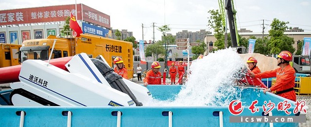 因雨勢加大,某地鐵站出現(xiàn)內(nèi)澇,嚴重影響地鐵運行安全。市城區(qū)防辦緊急調(diào)度防澇排漬搶險隊一輛高揚程排水搶險車趕赴現(xiàn)場處置……不必擔(dān)心,這驚險的一幕,只是2024年長沙市城區(qū)應(yīng)對超強降雨防澇排漬聯(lián)合應(yīng)急演練中的場景。5月15日,在隆平水稻博物館前坪,共有11支搶險隊伍、135人參加演練。一小時能吸干兩個泳池的超級吸水“牛魔王”5000型子母式大流量排水搶險車、排水揚程超過15層樓高的900型高揚程排水搶險車等排水“超級”裝備紛紛亮相、大顯身手。