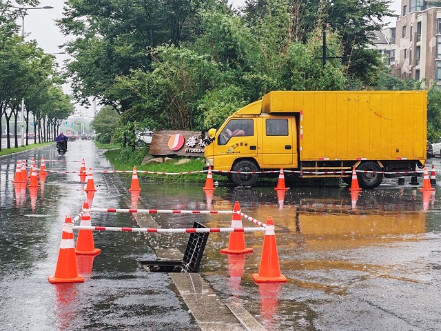 在局部地區,雖然出現了一時積水情況,但很快都排完。比如,在文昌西路江蘇銀行公交站臺附近,非機動車道在暴雨時出現了淺層積水,但很快排完;在邗江路海德公園附近,非機動車道一度出現積水,但市政人員很快到崗,打開窨井蓋,同時出動工程車輛,加速積水排出。