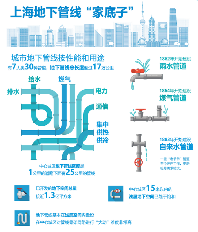 市政管線是城市的生命線。目前上海地下管網(wǎng)按性能和用途已有給水、排水、燃?xì)?、電力、通信、集中供熱供冷?大類30種管道,地下管線總長度超過17萬公里??傮w而言,上海的地下管線建設(shè)和管理一直處于全國領(lǐng)先水平。