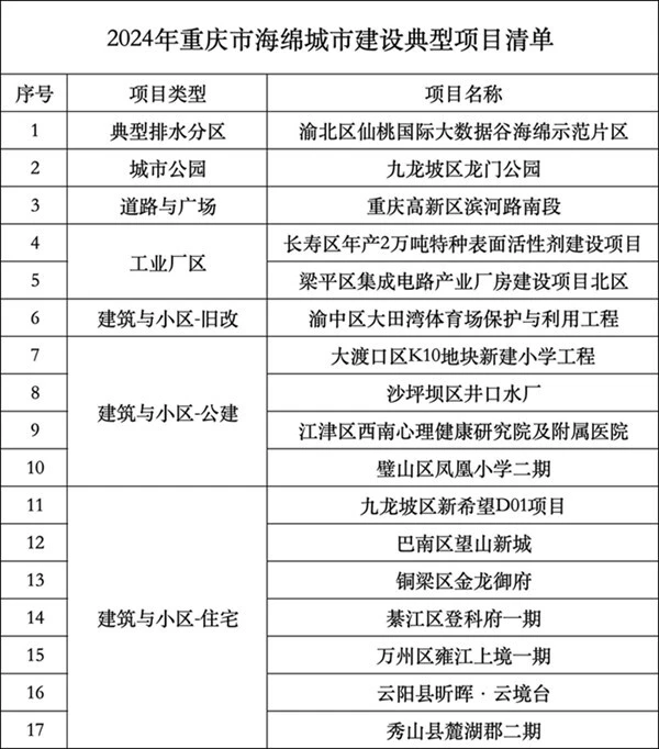 據了解,17個海綿城市建設典型項目分為典型排水分區、城市公園、道路與廣場、工業廠區、建筑與小區等類型。