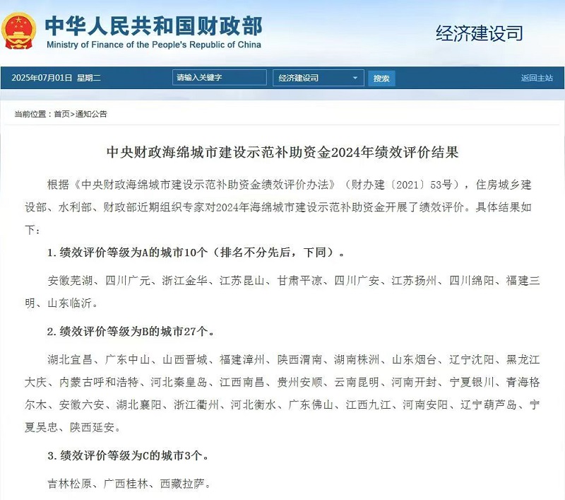 根據《中央財政海綿城市建設示范補助資金績效評價辦法》,住房城鄉建設部、水利部、財政部近期組織專家對2024年海綿城市建設示范補助資金開展了績效評價。具體結果如下: