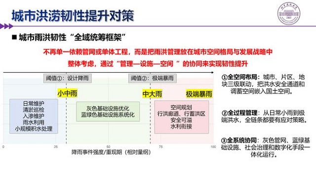 四、構(gòu)建“系統(tǒng)-空間-設(shè)施-治理”四位一體的防御體系 針對(duì)上述問(wèn)題,李俊奇教授強(qiáng)調(diào),必須徹底打破傳統(tǒng)的末端、灰色、碎片化的治理思想,從系統(tǒng)、空間、設(shè)施、治理四個(gè)維度協(xié)同發(fā)力,構(gòu)建一個(gè)全域統(tǒng)籌、平急兩用的綜合洪澇韌性體系。